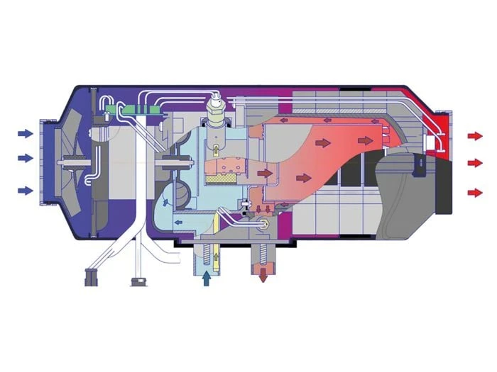Le chauffage fonctionne au diesel et a une faible consommation. Ainsi, le chauffage consomme 0,51 litre par heure à la puissance maximale et, 0,15 litre par heure en modulation.