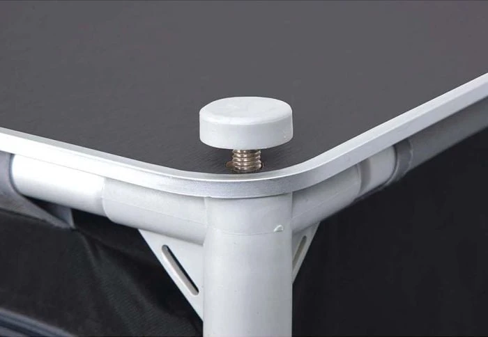 L’armoire Bo-Camp a un cadre léger en aluminium avec un tissu en polyester. Le plateau et les étagères sont fabriqués en MDF et pourvus d’un bord en aluminium. L’armoire est équipée de quatre pieds réglables afin que vous puissiez toujours la mettre à niveau sur une surface inégale. Une fois les vacances terminées, vous pouvez facilement démonter l’armoire et la ranger dans le sac de rangement inclus.