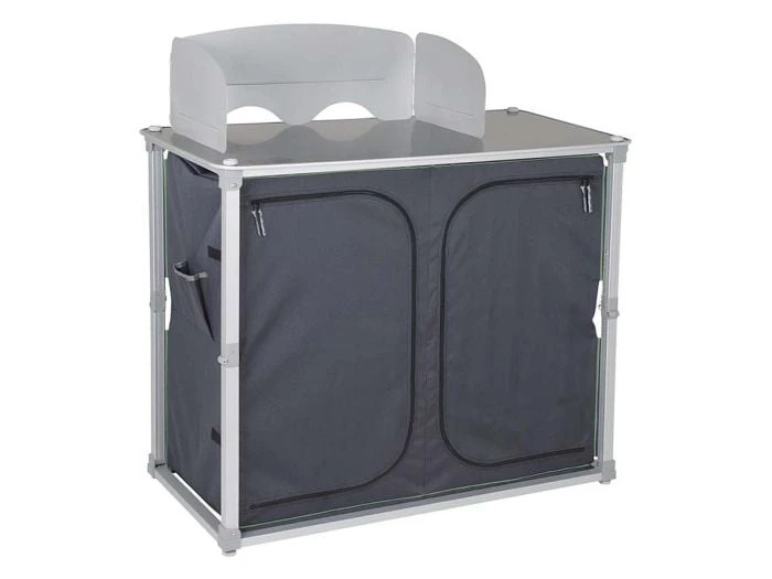La cuisine Quick-up Solid est une armoire de cuisine robuste avec un plan de travail résistant à la chaleur et à l’eau. L’armoire Quick-up est également équipée d’un paravent pour cuisiner à l’abri du vent et de 4 étagères spacieuses. Le paravent peut être utilisé avec un réchaud d’une dimension maximale de 61 x 42 cm.