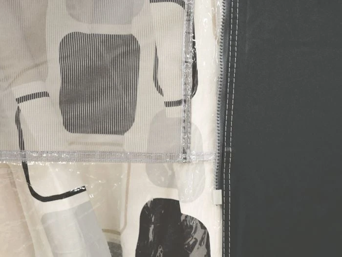 Les façades et les parois latérales sont entièrement amovibles, ce qui permet d’utiliser le toit comme une solette. Toutes les parois peuvent être légèrement enroulées afin d’être utilisées comme entrée. Vous pouvez donc choisir entre 4 endroits différents pour entrer dans l’auvent ! Une bonne ventilation est très importante. C’est pourquoi il y a une ouverture de ventilation verrouillable dans le faîte sous la casquette et les deux fenêtres latérales sont équipées d’une moustiquaire avec un volet transparent. Les deux coins sont équipés de clips pour le kit de sangles anti-tempête optionnel.