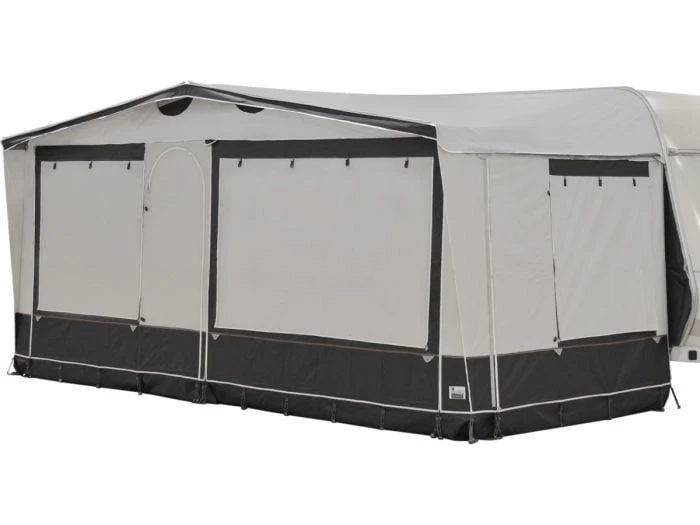 La façade du Sorrento 240 se compose de deux panneaux interchangeables. Vous pouvez ainsi choisir de positionner la porte à gauche ou à droite du centre. Grâce aux crochets pour les tendeurs échelle à l’intérieur et à l’extérieur, vous pouvez choisir de replier la bavette vers l’intérieur ou l’extérieur. D’autres caractéristiques uniques de du Sorrento 240 sont les deux ouvertures de ventilation permanentes dans le faîte sous la casquette, les clips pour sangle anti-tempête cousus et les fenêtres avec moustiquaire dans les deux parois latérales.