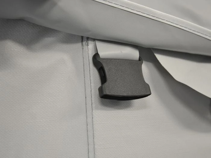 Pour un auvent 4 saisons, il est conseillé de choisir une armature d’auvent en acier robuste d’un diamètre de 28 mm. L’armature de base pour la taille 7 comporte 3 mâts et 3 barres de toit. Il est conseillé de renforcer l’armature de base par des barres de toit supplémentaires et des barres anti-tempête.