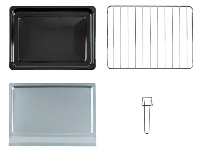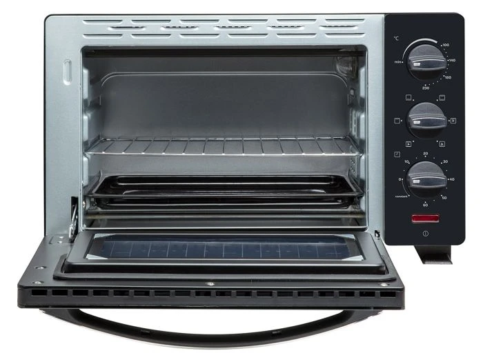 Le four a une capacité de 20 litres, une température réglable jusqu’à 230°C et une minuterie qui peut être réglée jusqu’à 60 minutes. Grâce au revêtement antiadhésif à l’intérieur, le four est facile à nettoyer. Le four est livré avec une plaque de cuisson, une grille et une plaque ramasse-miettes.
