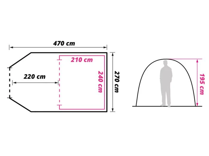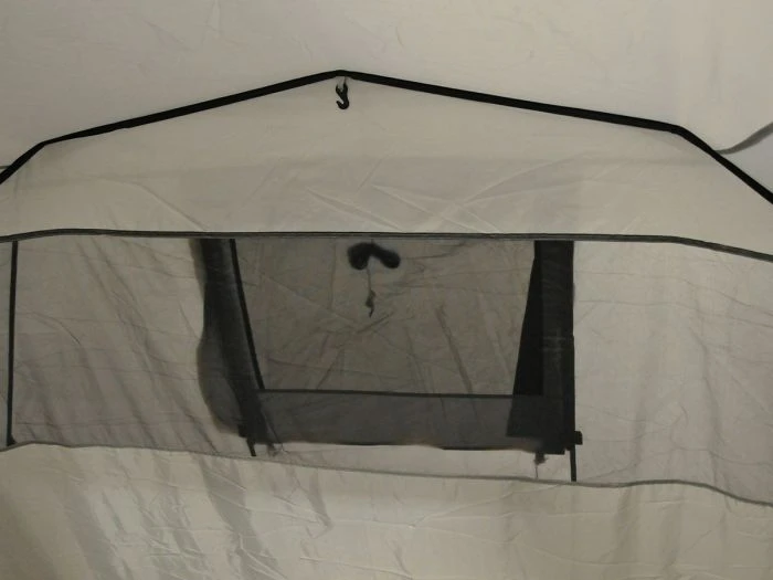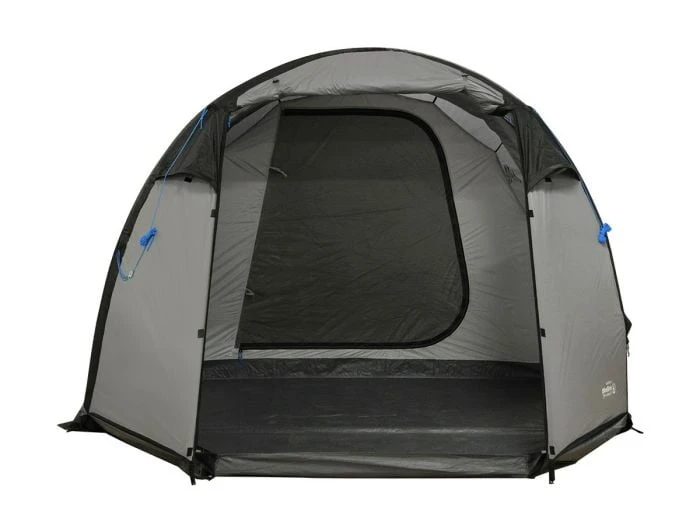 La cabine de couchage est équipée d’une porte moustiquaire supplémentaire et mesure 240 x 210 centimètres, suffisamment grande pour 4 tapis de couchage ou 3 matelas gonflable.