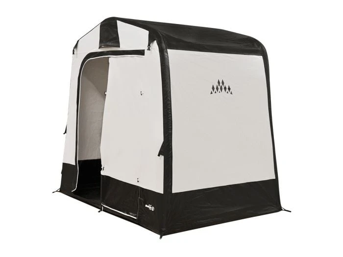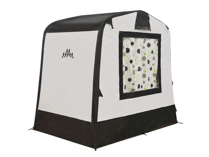 Grâce au tapis de sol fixe cuvette en PVC, l’eau de pluie, les courants d’air et les parasites restent à l’extérieur de la tente. Vos objets de valeur seront ainsi protégés et leur durée de vie sera plus longue. Avec une surface au sol d’environ 3,5 m², vous avez suffisamment d’espace pour les vélos, le barbecue et d’autres choses. La grande porte semi-circulaire peut être enroulée sur le côté. Grâce au seuil rabattable, vous pouvez facilement entrer dans la tente et éviter de trébucher. Le faîte est pourvu d’ouvertures de ventilation permanentes à l’avant et à l’arrière pour une bonne circulation de l’air. La grande fenêtre à l’arrière apporte beaucoup de lumière. Pour plus d’intimité, la fenêtre peut être couverte de l’intérieur avec les rideaux inclus.