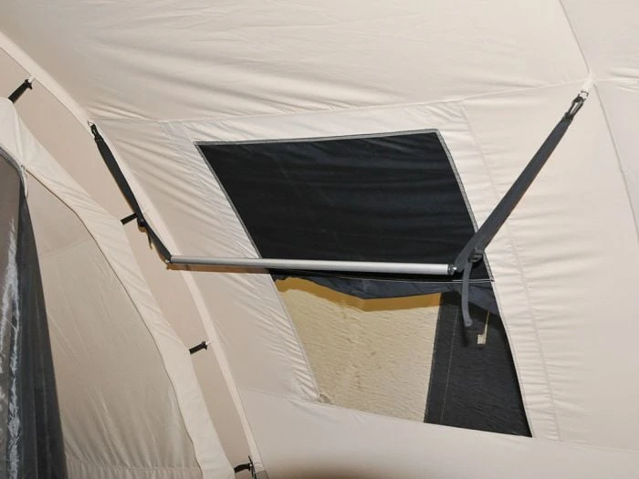 Dans la paroi arrière de la tente, se trouve une trappe de ventilation qui est protégée contre la pluie. À la même hauteur, elle se trouve également dans la cabine de couchage afin que celle-ci reste bien aérée.