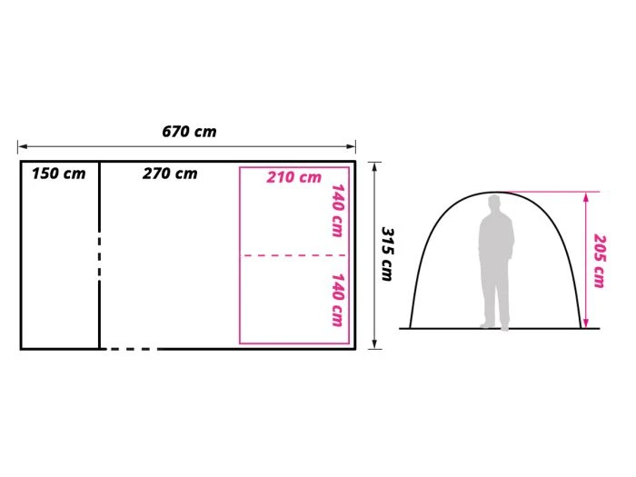 Grâce aux parois de séparation enroulables avec fermeture éclair, la tente intérieure spacieuse peut être divisée en deux cabines de couchage séparées. Chaque cabine de couchage a sa propre entrée et est équipée d’une porte double avec moustiquaire. À l’intérieur de la cabine de couchage, il y a des compartiments de rangement pratiques pour un livre ou un téléphone portable, par exemple. Chaque chambre peut accueillir un maximum de 2 matelas gonflables. Vous aimez le luxe et vous comptez utiliser cette tente pour deux personnes ? Vous pouvez alors enrouler la paroi de séparation et y placer un grand matelas gonflable haut afin de pouvoir profiter ensemble de tout le confort.