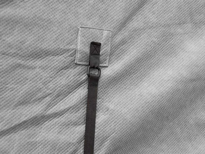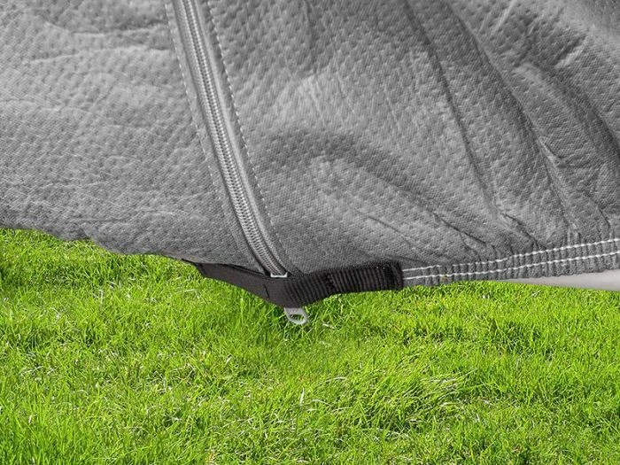 La housse caravane ProPlus peut être fixée à l’aide des sangles de fixation latérales, qui peuvent être fixées ensemble sous la caravane. La housse reste ainsi en place, même par vent fort.